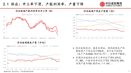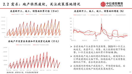 需求:本周玻璃需求环比略降、投机需求增加。当前玻璃终端地产行业疲软,1-11月竣工面积增速下降约18%,12月下旬玻璃深加工订单环比下降、同比减少约16%。近期玻璃下游需求环比下降,投机需求增加,需求对价格影响偏中性。后期需持续关注地产政策落地情况和对竣工端玻璃的影响。