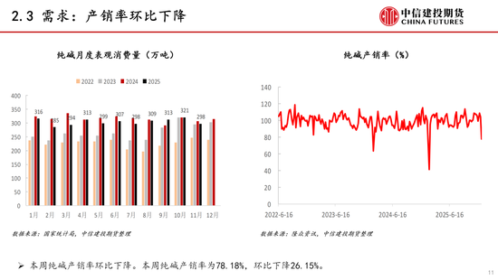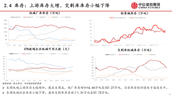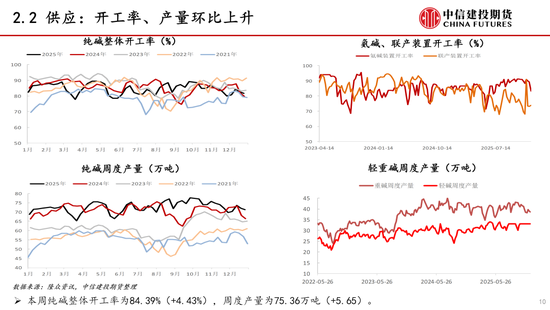 供应:本周纯碱供应环比上升。本周纯碱检修安排减少,产量环比增加。下周纯碱检修计划较少,预计产量小幅增加。近期纯碱检修安排减少,新增产能投放,供应端压力较大。