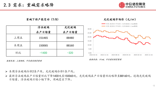 需求:本周纯碱需求略降。近期重碱需求下降,轻碱需求持稳。本周浮法玻璃冷修2条产线、光伏玻璃冷修1条产线,近期浮法、光伏玻璃日熔量之和下降。短期中下游采购积极性一般,碱厂新订单增加。后期继续关注光伏玻璃和浮法玻璃产线变动情况。