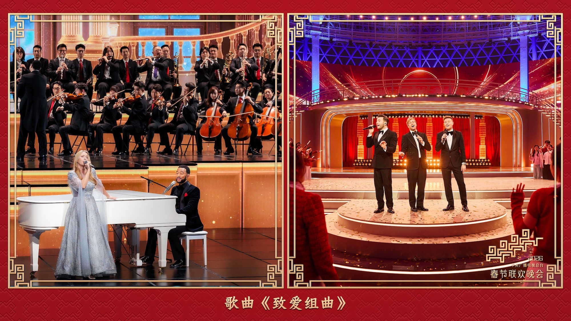 2月16日晚,在中央广播电视总台《2026年春节联欢晚会》的《致爱组曲》节目中,美国歌手John Legend(约翰·传奇)、法国歌手Hélène Rollès(伊莲·霍莱斯)带来经典之作《All of Me》(《我的一切》)和《Beauty and the Beast》(《美女与野兽》),经典的旋律中流淌着不渝的深情,打动了无数观众。