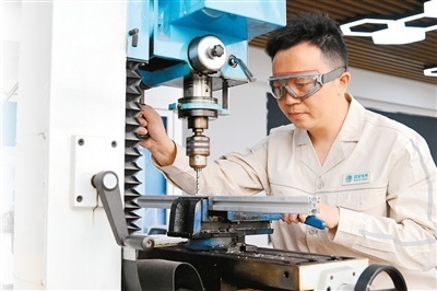 r何涛在工作室操作铣床加工无人机零部件。 周 正摄